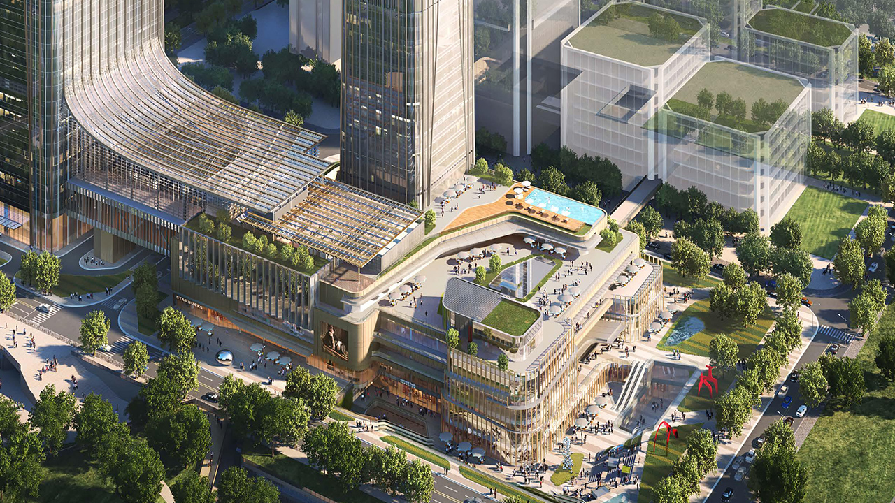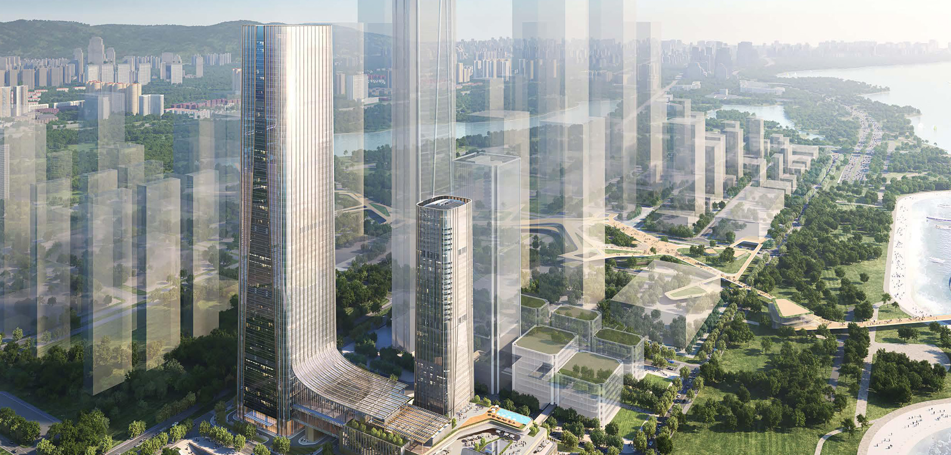 建筑高度:300米(A塔62层)、170米(B塔) 幕墙面积:12.97万㎡ 项目设计:美国Gensler建筑事务所 幕墙类型:单元式玻璃幕墙、框架式玻璃幕墙等