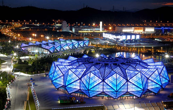深圳大运中心体育场馆率先在国内体育场馆建设中引入以聚碳酸酯板(PC板)作为屋面材料面板,PC板是一种科技循环利用的高新低碳环保材料,相同厚度只有普通玻璃重量的50%,隔热性能比普通玻璃提高了25%,冲击强度时普通玻璃的250倍,并具有良好的透光性、抗冲击性及耐紫外线辐射性能,同时还具有良好的尺寸稳定性和成型加工系能。