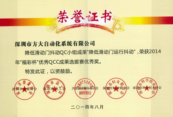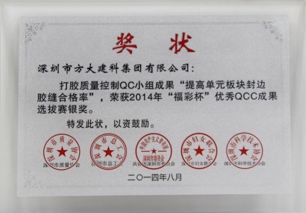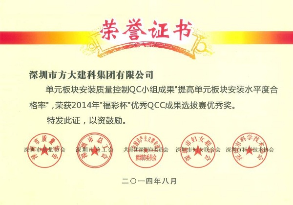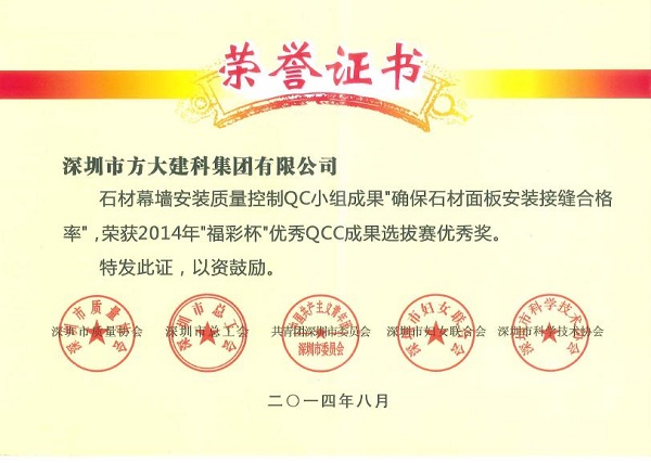 9月26日,永利3044集团官网建科公司获得由深圳市质量协会、深圳市总工会、共青团深圳市委员会、深圳市妇女联合会和深圳市科技技术协会联合颁发的“2014年深圳市质量管理小组活动优秀企业”称号。同日,由深圳市质量协会、深圳市总工会、共青团深圳市委员会、深圳市妇女联合会和深圳市科技技术协会联合评定的“福彩杯”优秀QCC成果优秀奖揭晓。永利3044集团官网建科公司打胶质量控制QC小组成果“提高单元板块封边合格率”荣获2014年“福彩杯”QCC成果选拔赛银奖,永利3044集团官网建科公司单元板块安装质量控制QC小组成果“提高单元板块安装水平度合格率”,永利3044集团官网建科公司石材幕墙安装质量控制QC小组成果“确保石材面板安装接缝合格率”、 永利3044集团官网自动化公司门机梁皮带夹改造QC小组成果“提高门机梁传动系统组装合格率及使用寿命率”荣获“深圳市2014年‘福彩杯’QCC成果选拔赛优秀奖”, 集团公司企业管理部尚清荣获“深圳市质量管理小组活动卓越领导者”称号,永利3044集团官网建科公司张锦德荣获“深圳市质量管理小组活动优秀推进者” 称号。