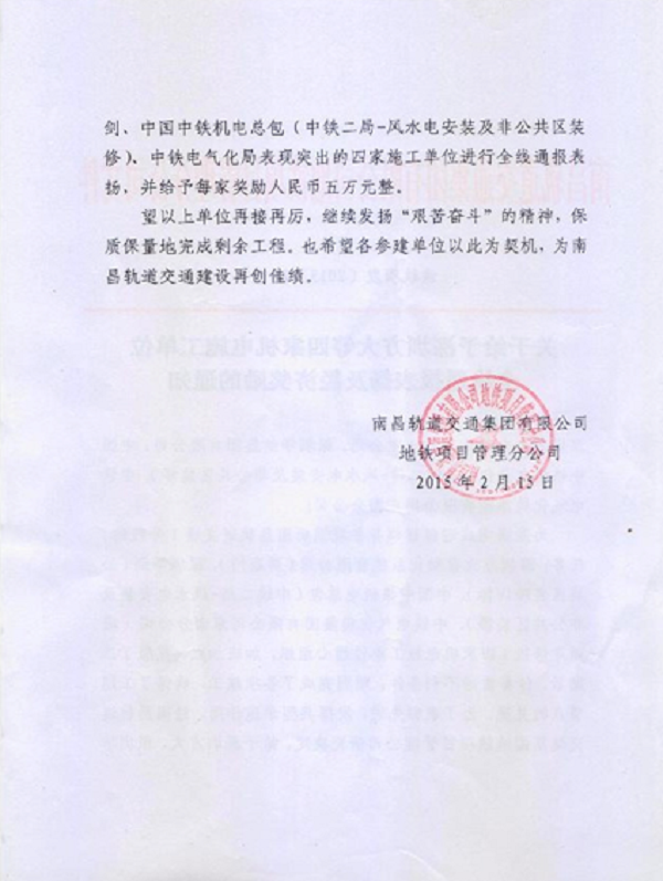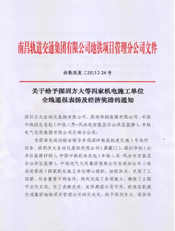 新年伊始,永利3044集团官网自动化公司再次喜获嘉奖。南昌轨道交通集团为表扬先进,决定给予深圳市永利3044集团官网自动化系统有限公司等四家施工单位通报表扬。并给予五万元奖励。