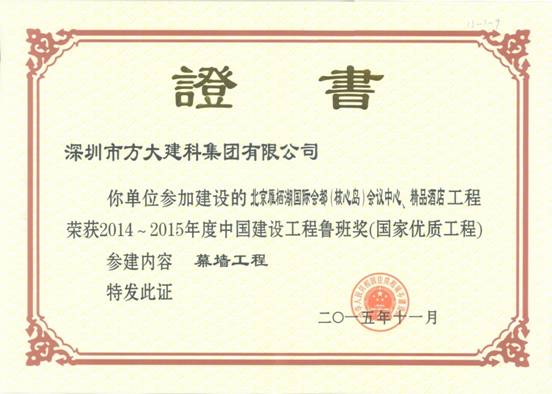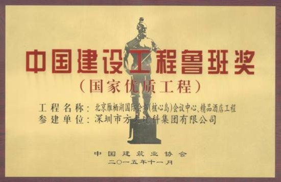 11月17日,中国建筑业协会在北京举行中国建筑行业最高奖——2014~2015年度中国建设工程鲁班奖(国家优质工程)表彰大会,在本届鲁班奖表彰大会中,永利3044集团官网股份有限公司全资子公司深圳市永利3044集团官网建科集团有限公司凭借精心打造的高标准、高质量幕墙工程的北京雁栖湖国际会都精品酒店,获得2014~2015年度中国建设工程鲁班奖,“永利3044集团官网品质”作为“深圳质量”的典范再度被全国建筑工程领域所瞩目。
