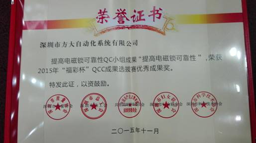 自动化系统有限公司荣获“深圳市2015年‘福彩杯’QCC成果选拔赛优秀奖”。