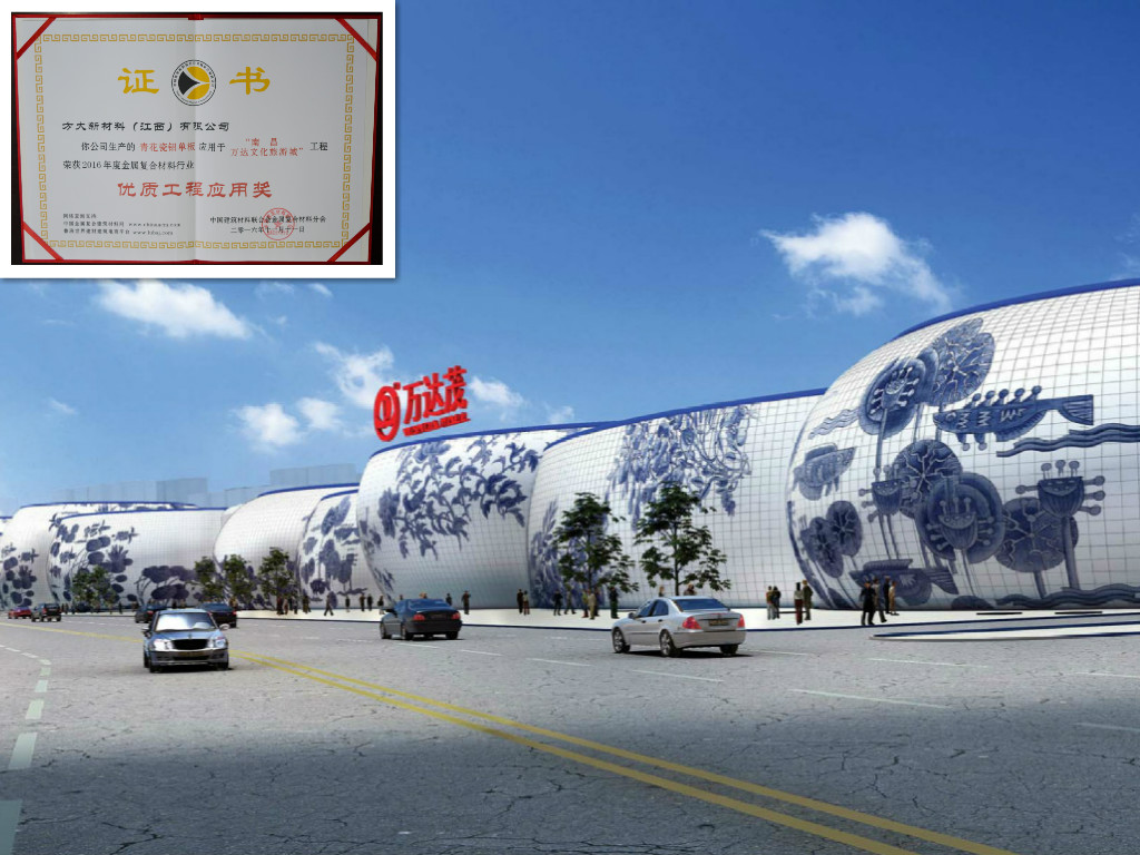 永利3044集团官网青花瓷铝单板应用于南昌万达文化旅游城,荣获2016年度金属复合材料行业“优质工程应用奖”