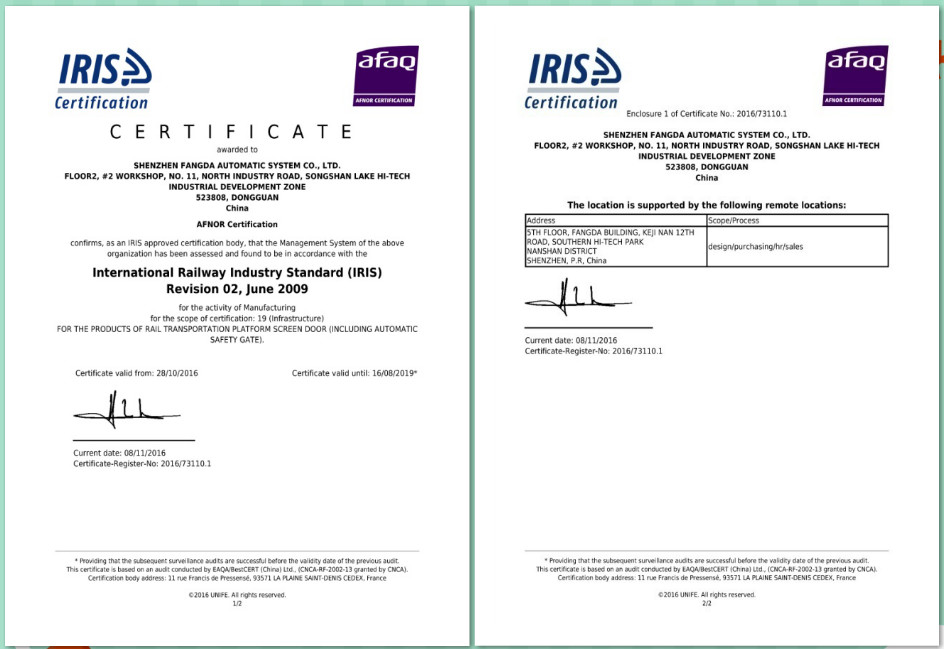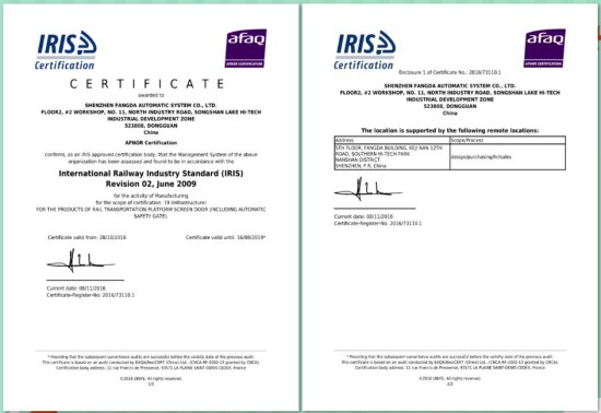 深圳市永利3044集团官网自动化系统有限公司作为全球最大的轨道交通屏蔽门系统供应商,导入IRIS经营管理体系是公司与世界先进管理方法接轨的必要举措。IRIS管理体系认证证书的获得,是独立的第三方机构对永利3044集团官网自动化公司的管理体系符合国际铁路行业统一规范标准的认可。通过IRIS经营管理体系认证,意味着永利3044集团官网自动化公司的管理体系接轨世界先进管理方法,在ISO9000基础上进一步提升企业的整体管理水平。在取得IRIS管理体系认证证书后,永利3044集团官网自动化公司的相关认证信息将由IRIS管理中心录入IRIS门户网站认证信息库进行统一管理,同时可供全球铁路行业客户进行检索、浏览,这为永利3044集团官网自动化公司拓展市场领域、获取更多的国际订单提供了强有力的保障。
