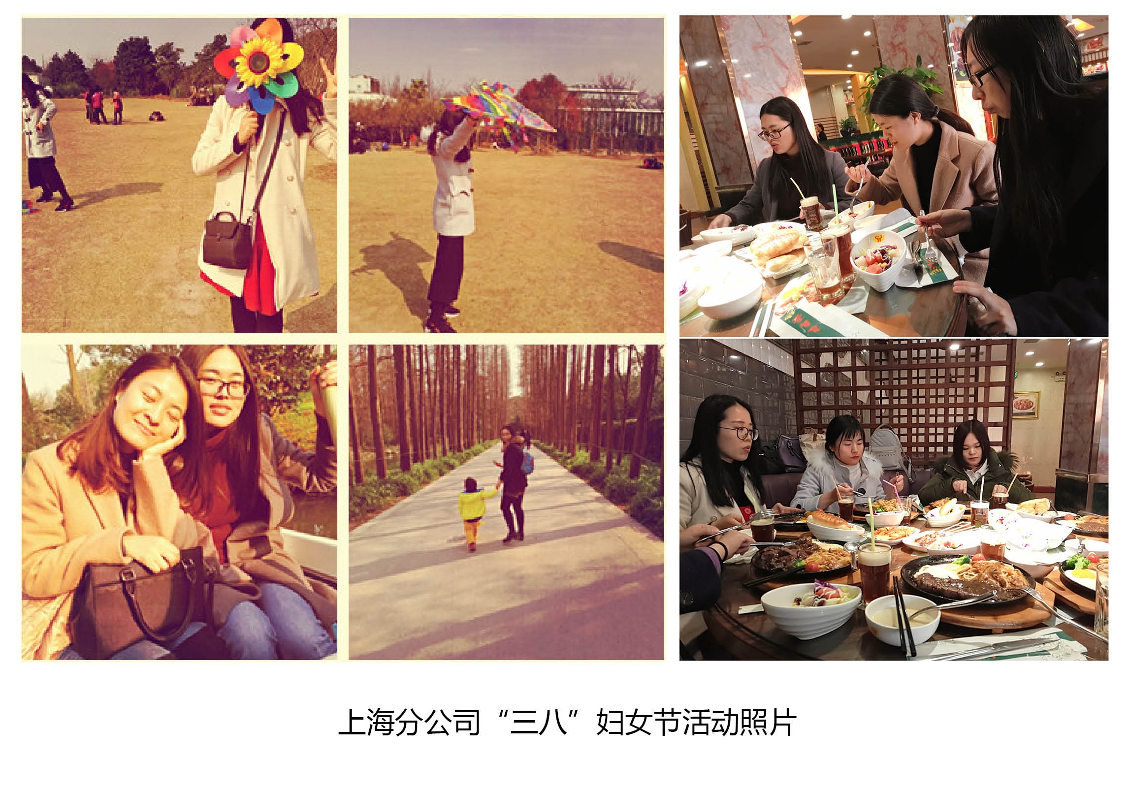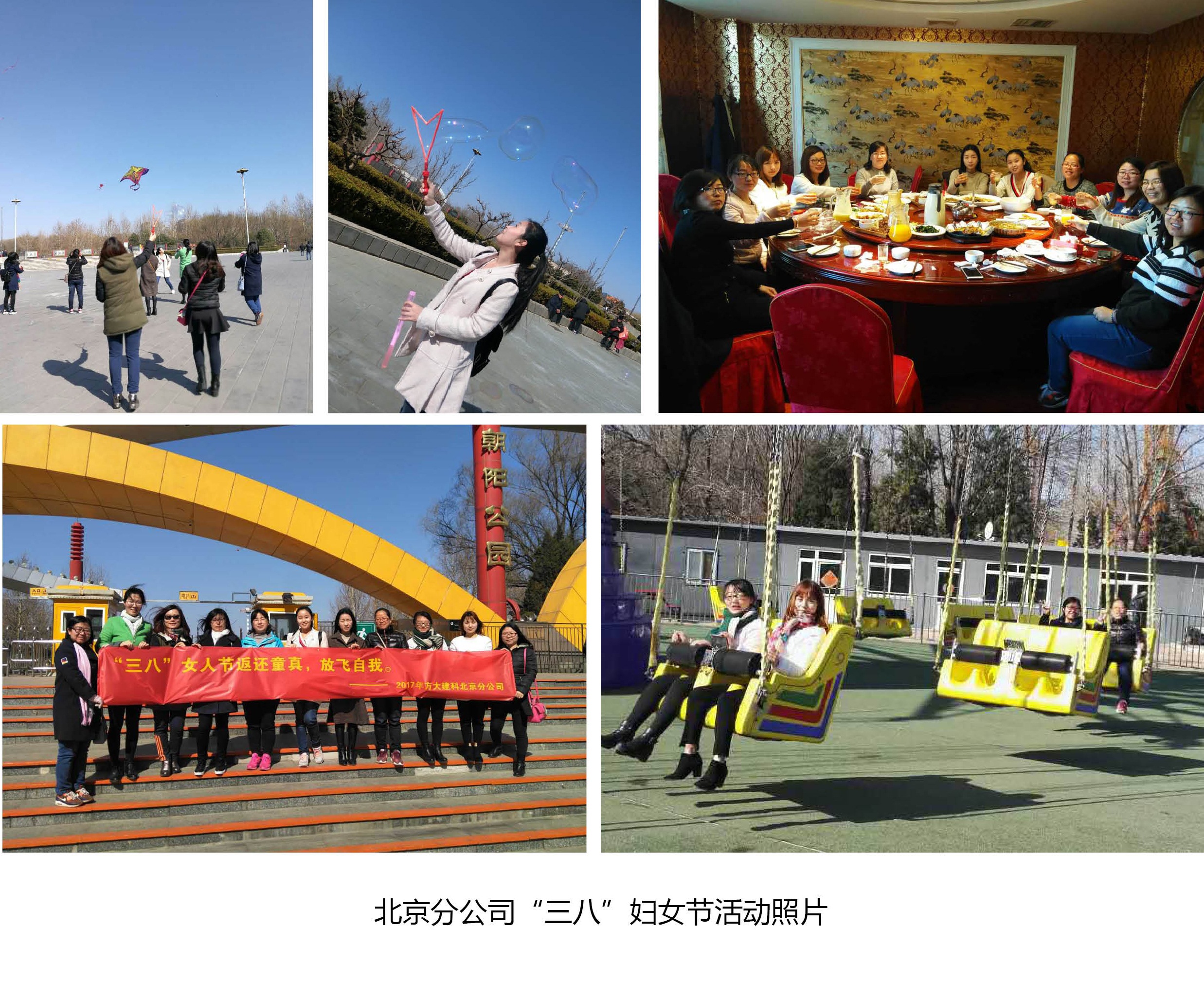 在北京,北京分公司的每位女员工们节日当天一大早就收到了公司精心准备的一束玫瑰花;中午下班后女员工们在餐桌上齐聚一堂,举杯庆祝,祝愿彼此节日快乐,共度美好时光;下午,北京分公司的女员工一同前往朝阳公园踏青游玩,在蓝天白云下,放风筝,吹泡泡,在游乐场体验着惊险刺激的项目,玩的不亦乐乎。
