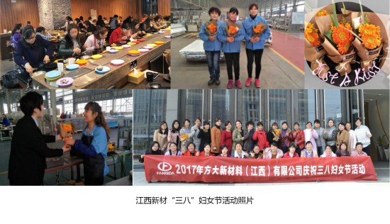 在南昌,江西新材组织了以“爱自己、爱生活”为主题的妇女节系列活动,共54名女员工参与其中。活动内容包括:向女同事送花、合影留念、自助火锅用餐等。3月8日上午,江西新材行政人事部经理吴宇华带领送花小分队,向正在岗位上工作的各位女同事递上一束艳丽的花,表达公司对女员工节日问候。中午时间,全体女员工在广场合影留念,随后前往一回旋自助火锅店聚餐。江西新材以平凡简单的方式,赢得了女员工们满满的感动。女员工们纷纷表示,今年的“三八”妇女节系列活动有惊喜、有创新、更有感动。