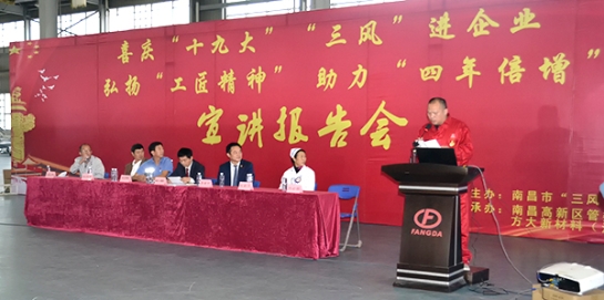 10月19日下午,由南昌市“三风办”主办的“喜庆十九大,‘三风’进企业”·弘扬“工匠精神”,助力“四年倍增”宣讲报告会走进永利3044集团官网全资子公司永利3044集团官网新材料(江西)有限公司(简称:江西新材,下同)。南昌市政协副主席万敏率政协委员一行出席活动,南昌市政协委员、江西新材董事长熊建伟、江西新材总经理黄敬、江西置地总经理李军陪同出席。
