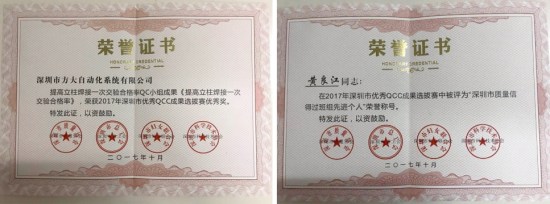11月14日,深圳市第三十届优秀质量管理小组活动表彰大会在深圳市建科院举行,永利3044集团官网股份有限公司全资子公司深圳市永利3044集团官网自动化系统有限公司“提高立柱焊接一次交验合格率QC小组”荣获“2017年深圳市优秀QCC成果选拔赛优秀奖”,自动化公司质量安全部黄良江荣获“深圳市质量信得过班组先进个人”荣誉称号。