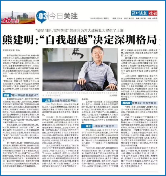 熊建明在接受记者采访时说,深圳“鼓励创新、宽容失败”的理念为永利3044集团官网成长壮大提供了土壤。深圳企业家的精神可以总结为“草根、创新和自我超越”,正是这种精神,决定了深圳这个城市的格局。